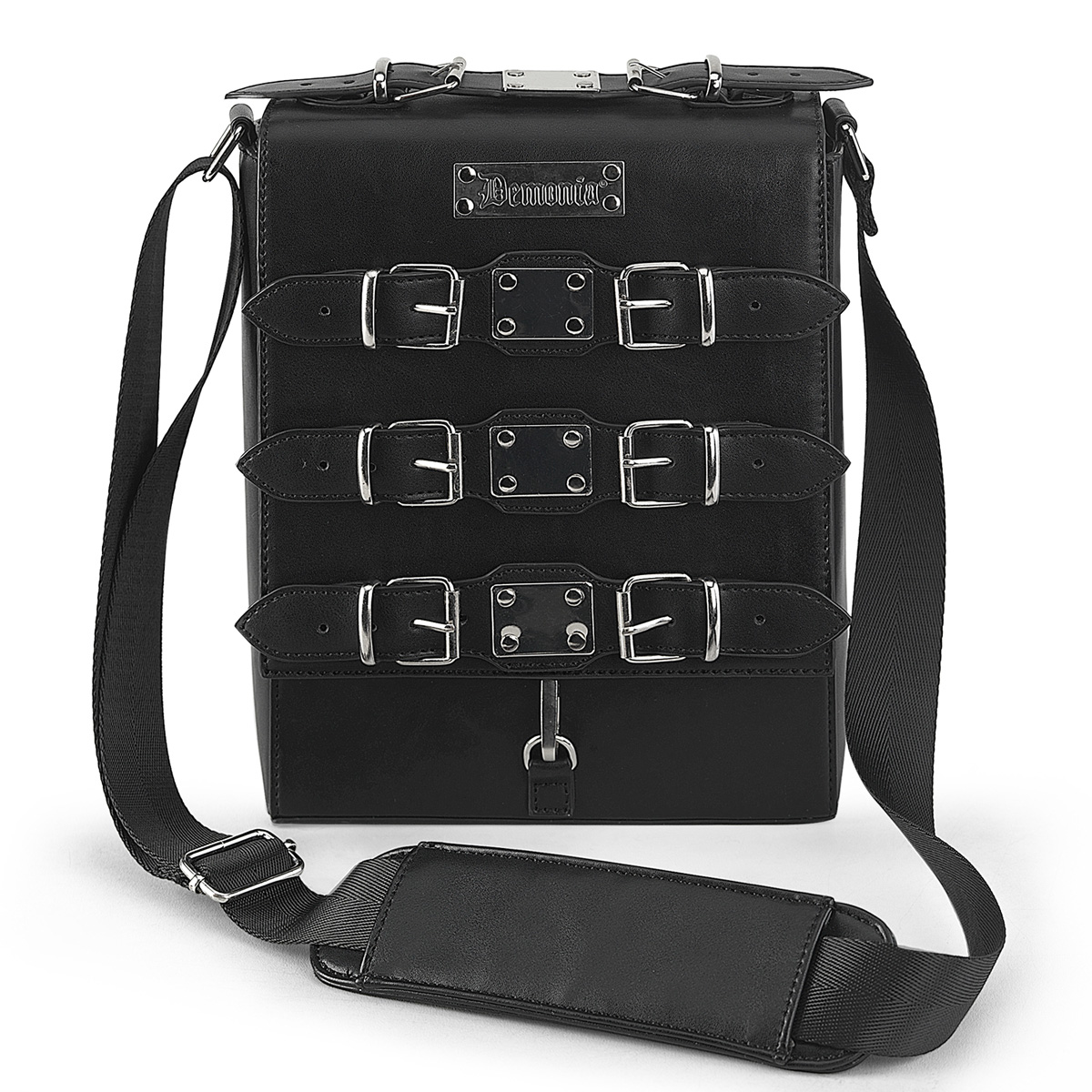 Faux Leather Crossbody Adjustable Padded Shoulder Strap Bag Featuring Large Flap w/ 4 Ornamental Buckle Straps w/ Metal Plates at Center, Inner Zip Pocket Detail, Hinged Claw Closure Approximate Size: 20x26x8 cm